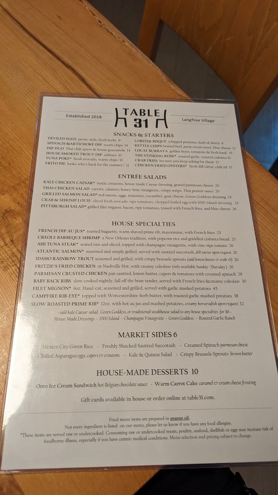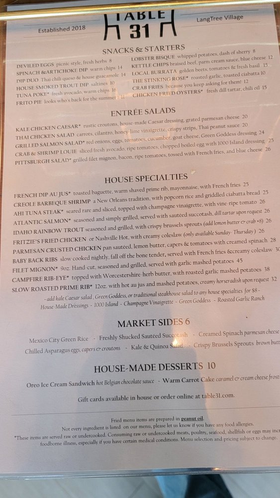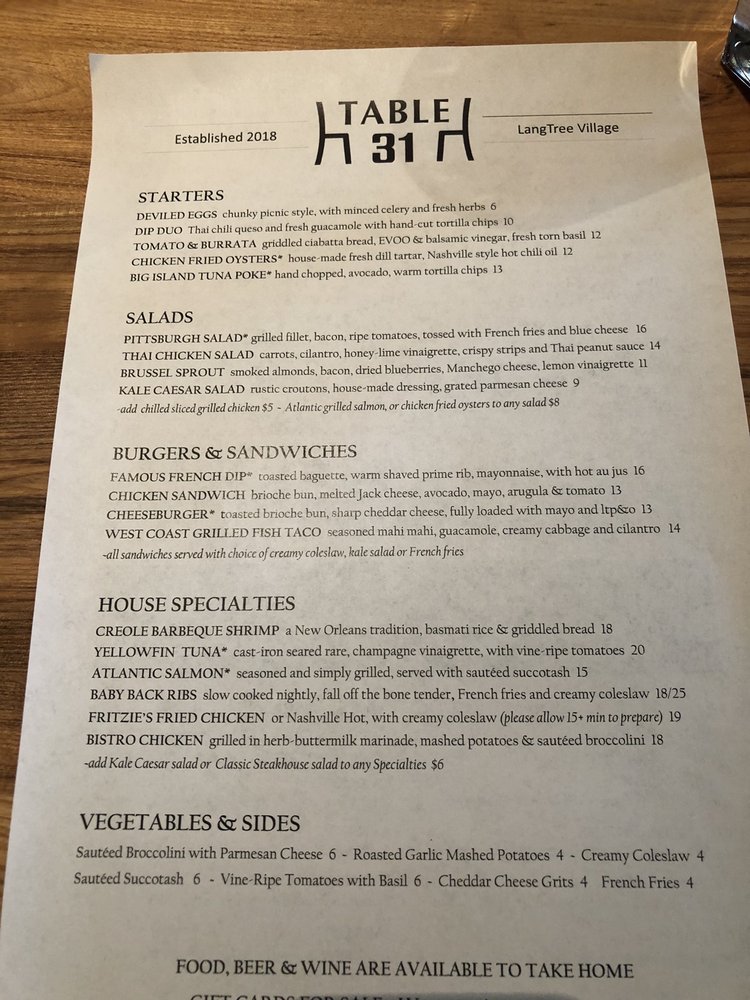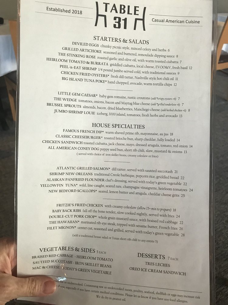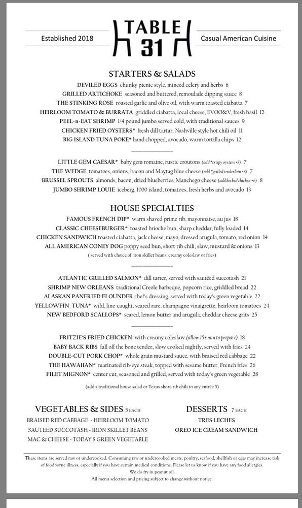 Table 31 is a New American restaurant located in Mooresville, NC, offering a casual yet upscale dining experience. With a diverse menu that includes starters like Deviled Eggs and Big Island Tuna Poke, as well as salads like the Pittsburgh Salad and Thai Chicken Salad, there is something for everyone. Their burgers and sandwiches, such as the Famous French Dip and Cajun Fish Sandwich, are both delicious and satisfying. Customers rave about the quality of the food, with reviews mentioning dishes like the chicken fried oysters and the kale chicken Caesar salad. The atmosphere at Table 31 is clean, comfortable, and welcoming, making it a great spot for a meal with friends or family. With options for vegetarians, a full bar, and excellent service, Table 31 is a must-visit dining destination.